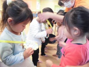 素敵なプレゼントをいただいたお返しに、りんご組さんからは歌とリボンに花とストローを通して作った首飾りをプレゼント ![]()