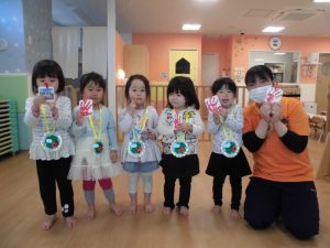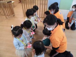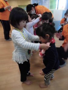 手作りの首飾りは、もも組といちご組のお友だち、そして先生たちに