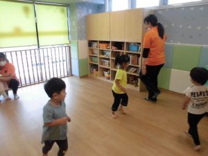 今月の前半は《立つ》《座る》《歩く》《止まる》の基本動作、後半は《ラインの上を歩く》など、保育者の指示に耳を傾け動く練習をしています。