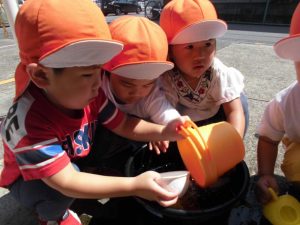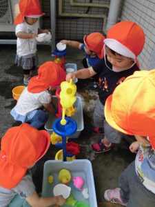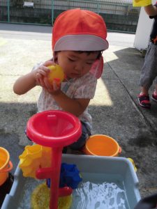 いちご組さんは保育者の真似をして玩具を使いながらすくってはこぼし、水の動きを興味津々に観察する姿が見られました