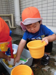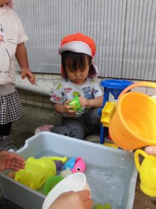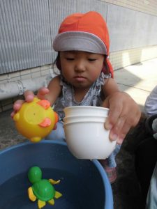 玩具を水に浮かべたり、すくって水の感触を楽しんだり・・・