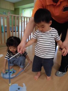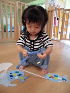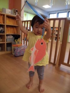 思うようにいかなくて、直接魚のクリップに釣り竿の磁石を近づけていた子も何度か繰り返すうち、的をめがけて釣り竿を垂らすことが出来るようになりました