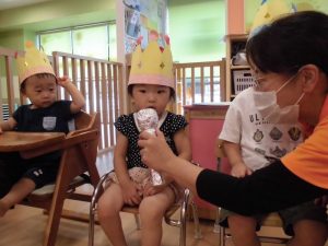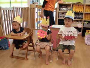 8月生まれのお友だちは、もも組の女の子1名、いちご組の女の子1名、りんご組の男の子1名の3名![]()