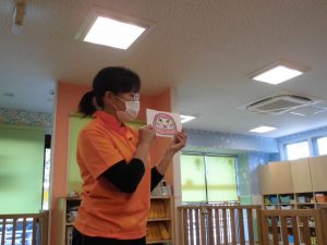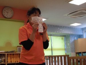 先生からの出し物は子どもたちの大好きな『いないいないばあ』と『にらめっこの』のペープサートでした![]()