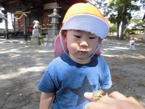 いちご組は保育者が蛙を捕まえると、興味津々で近くに来て見ています?