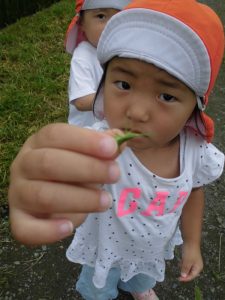 りんご組はバッタや蛙を自分で捕まえられるようになり、散歩の途中で見つけると嬉しそうに虫かごの中に入れて持って帰って来ます![]()