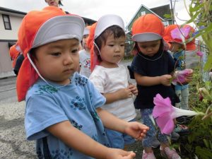 保育者が「あさがおって言うんだよ」と教えると保育者の真似をして「あ・さ・が・お」とかわいい声で言っていました✨