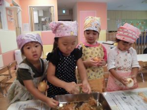 小田原園では食育の一環として、いちご組は1か月に1回、りんご組は1か月に2回給食作りのお手伝いをしています。