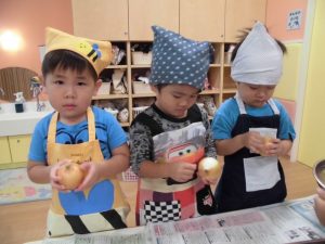 いちご組は初めて玉ねぎの皮むきを行いました✨