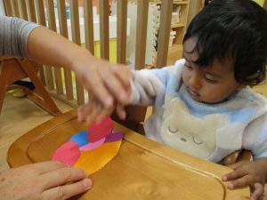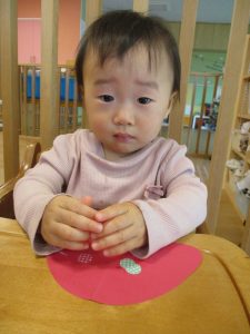 1歳児は「どんぐりころころ♪」の歌に沿った製作をしました
