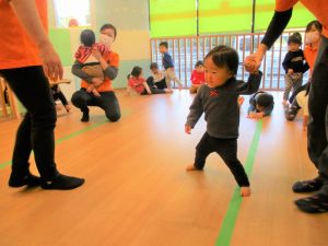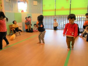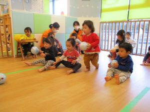 保育者が少し速いボールを転がすとしっかりキャッチをして、素早く転がして保育者に返すことが出来ていました![]()