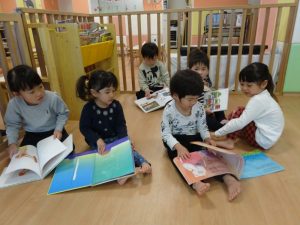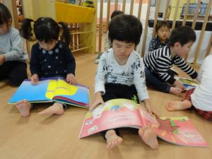 先生の真似をしてお友達に読み聞かせをする子もいますよ(^-^)