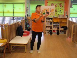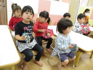 ペープサートが始まると保育者と一緒に『あわてんぼうのサンタクロース』の歌をタンバリンや鈴を鳴らしながら楽しそうに歌っていました![]()