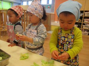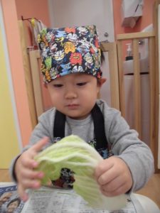りんご組は白菜ちぎりをしました。エプロンも自分で着けられるようになってきました✨