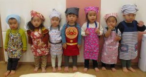 保育者にエプロンを着けてもらうと準備万端(^-^)