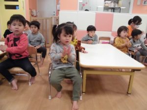 お誕生児は前に出ると、少し緊張した様子でしたが、2歳児は、大きな声で上手に名前と年齢が言えました!(^^)!
