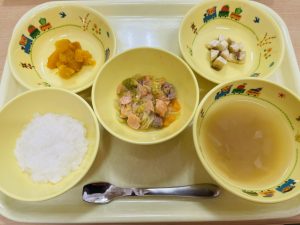 ご飯 味噌汁 鮭のちゃんちゃん焼き かぼちゃの甘煮 キウイ