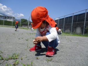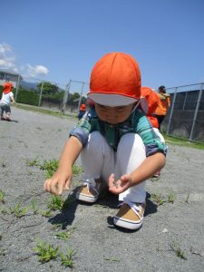 広場には、シロツメクサやタンポポ、他にも様々な花が咲いており、摘んでは保育者に見せてくれていました?