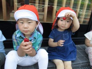 そして、保育園で育てている苺がまた大きく熟し、収穫の時を迎えたので、代表してりんご組さんが取ってくれました?