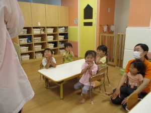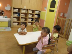 午後のおやつ前に読んだので、絵本の動物たちを思い出しておやつを食べながら「おいしい!」と‘おいしいポーズ‘をとっている子どもたちもいました![]()