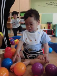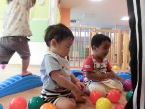 また、カラーボールを平均台の輪の中に入れると、ボールプールのように中に入ってバシャバシャとしてみたり、外側に投げてみたりと全身を使って遊んでいました。ボールを怖がる姿もありましたが、次第に慣れてきたようで、手に取って握ってみたり、保育者と投げ合いを楽しんだりしました