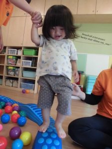 初めはうまく歩けず、転ぶ姿も多かったのですが、保育者が手を繫ぎながらリードするとだんだんと上手に歩けるようになってきましたしばらくすると子供たちの方から手を放してみたりと一人で挑戦しようという気持ちが芽生えてきたように感じます