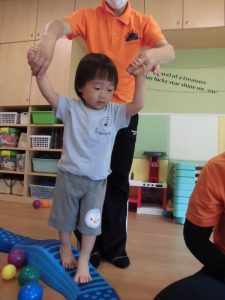 まず、室内遊びでは、平均台やカラーボール、風船を出して遊びました。