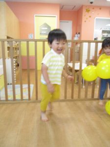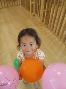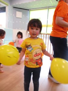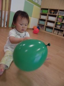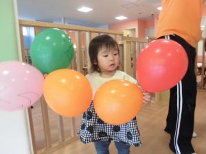 そして、風船を出すと舞い上がる風船を見て、「きゃー!!」と喜ぶ姿が見られました風船を抱きしめてみたり、保育者の真似をして上に投げてみたり、風船の感触を楽しんでいましたよ??