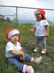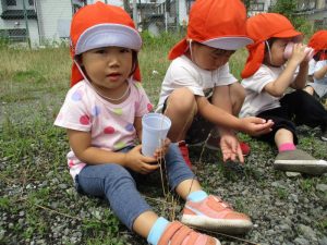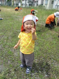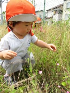 広場に着くと早く遊びたいとうずうずしながら動き出す子ども達茂みの中を探検しに行ったり、花や石を拾って「お土産ー」と嬉しそうに見せてくれたり、側を通った電車にバイバイしたりと、戸外遊びを存分に楽しんでいました