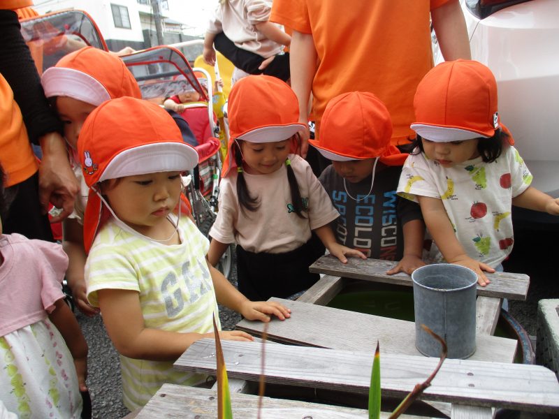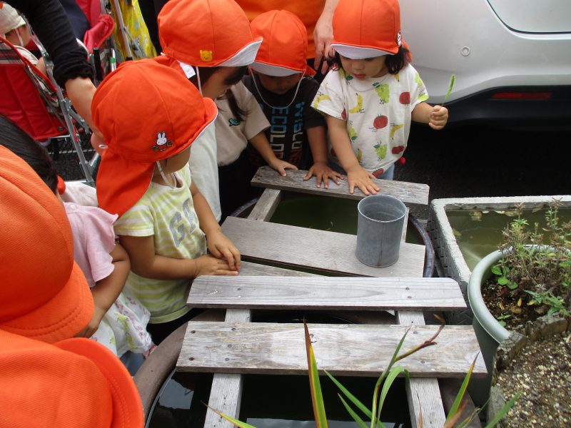 メダカが見えると「いた!」と嬉しそうな表情になり、またメダカが水に潜ってしまって見えなくなると「いなくなっちゃった~」と残念そうな表情になり…子どもたちの感情がよく伝わってきて、とても可愛らしかったです