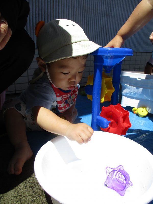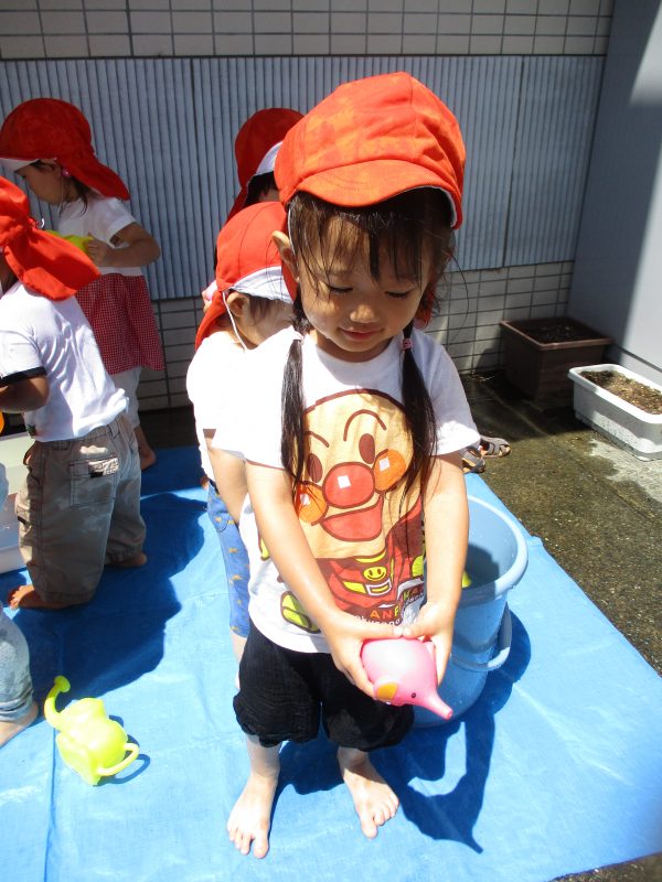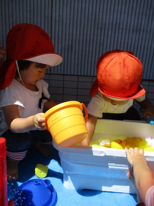 バケツに入っている水に触れてその水の冷たさを楽しむ子、ジャーッと流すことを楽しむ子、友だちと掛け合って楽しむ子など、様々な楽しみ方で水遊びを楽しんでいました![]()