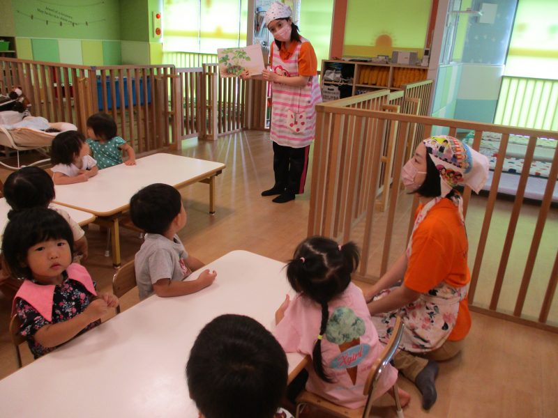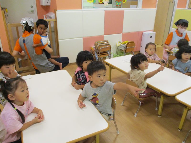 トマトが出てきた際は「トマト みどりのみ?」と問いかけるのですが、子どもたちは「違う、赤い!」「まだおいしくない(青いから収穫できない)」との言葉が子どもたちから聞こえてきました![]()