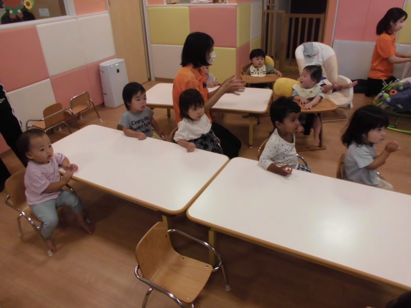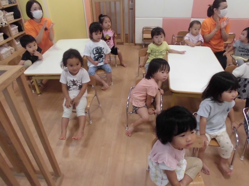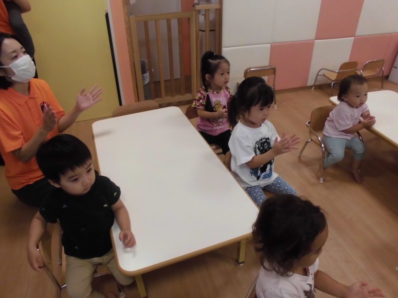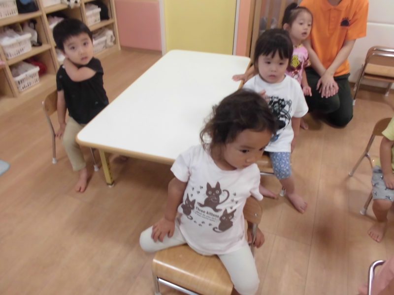 「〇〇ちゃん、〇〇ちゃんはどこでしょう~?」と手遊びをしながらお名前を呼ぶと元気に返事をして前に出てきてくれました?