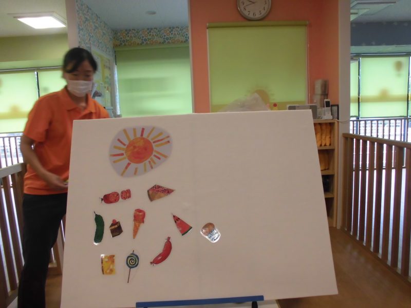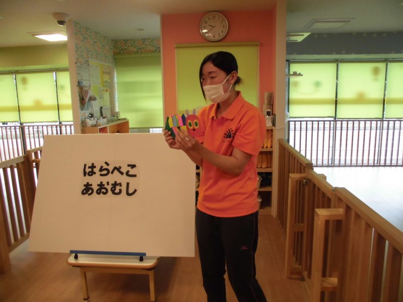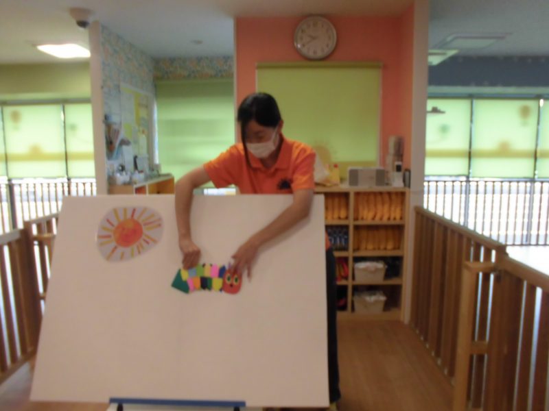 保育者からの楽しい出し物は「はらぺこあおむし」のパネルシアターです♪(^∇^*)