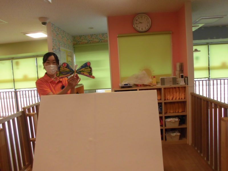 最後にあおむしがきれいな蝶々に変わり、パタパタと舞う姿に子どもたちからも「おぉー!」と歓声が聞こえ、もも組の子供たちは蝶々を一生懸命、目で追っていました?