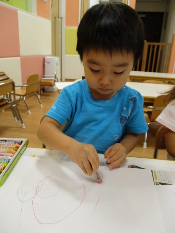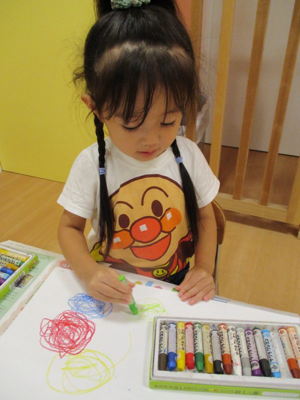 子どもたちが大好きなクレヨンを使ったお絵描き!少しずつ色の名前を覚えてきて、「これは赤」「青も好き」などの言葉が聞かれるようになりました。