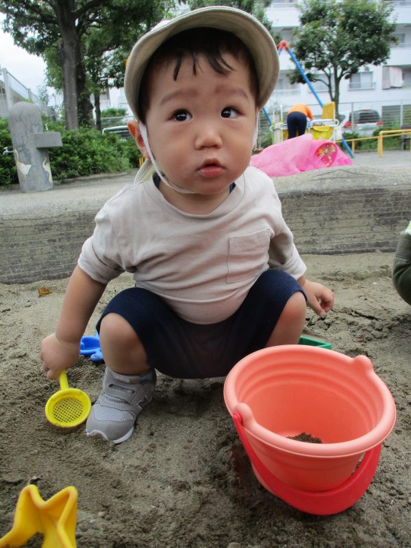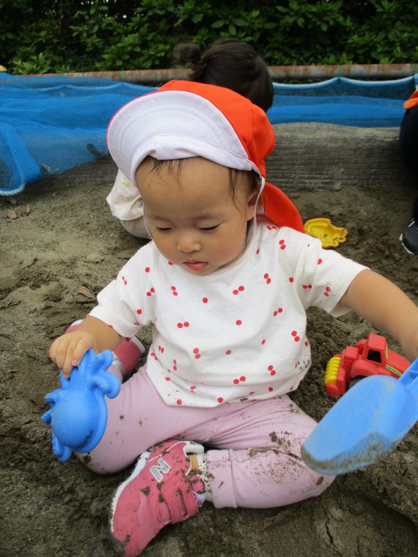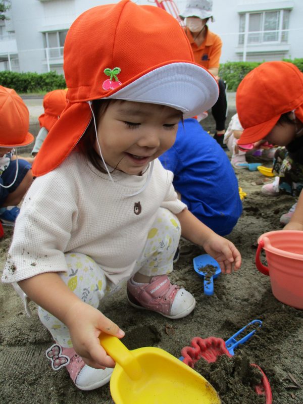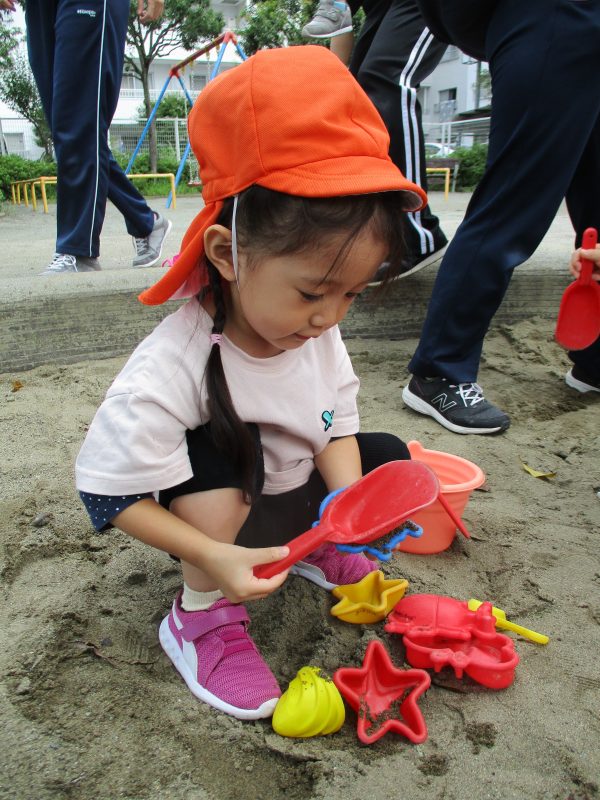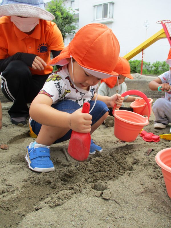子どもたちは好きな玩具を手に持ち、一生懸命に穴を掘ったり、砂をバケツに詰めたりしています!