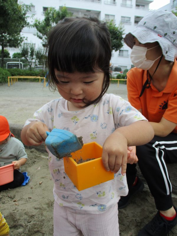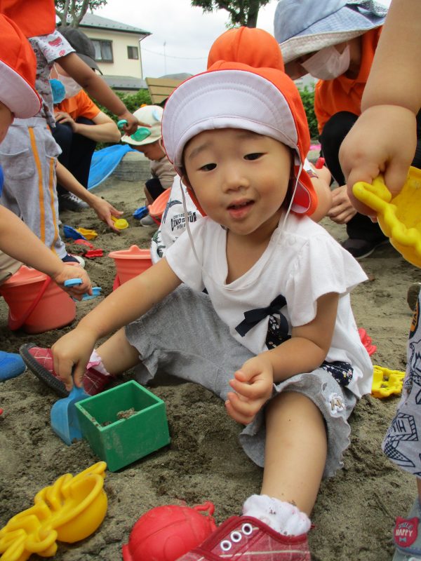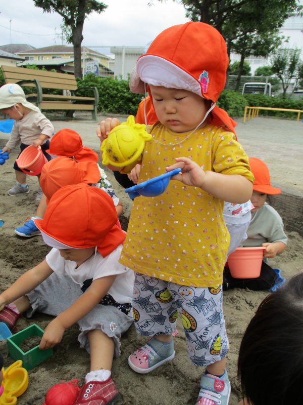 子どもたちの想像力はとても豊かで、バケツに詰めるだけではなく、これは「ホットケーキだよ」「これはお団子なの」と見立て遊びを楽しんでいます![]()