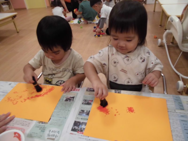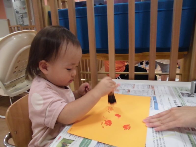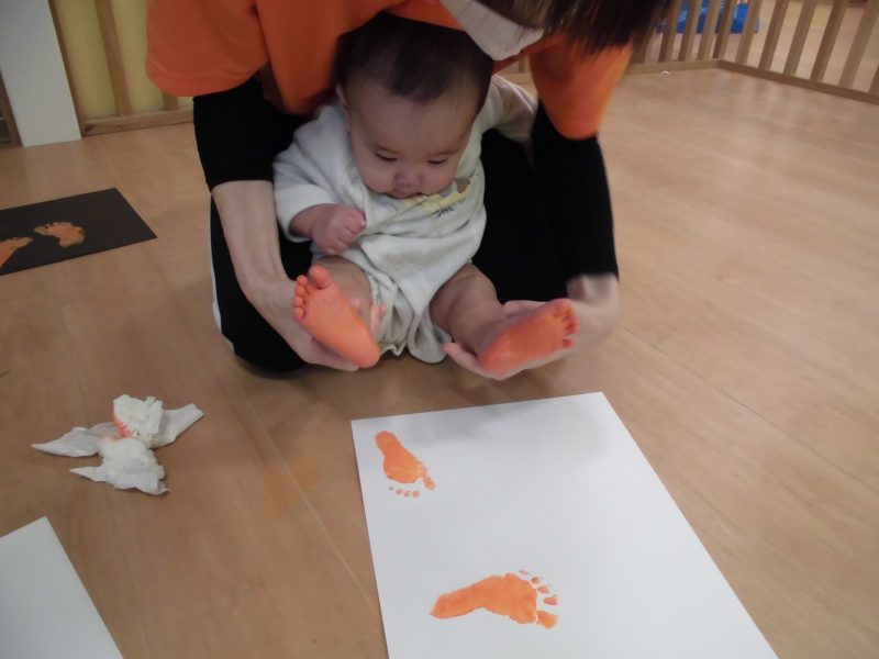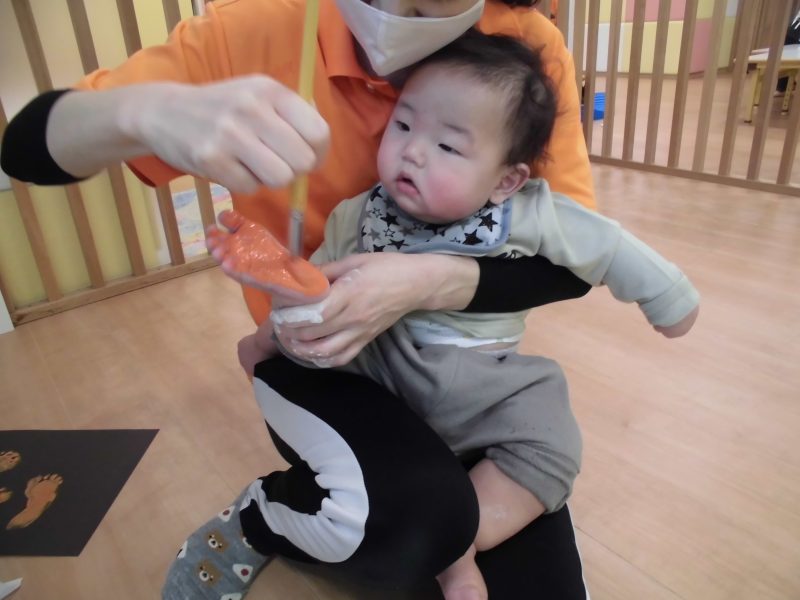 5月にも足型を取りましたが、心も身体も大きくなり、足に付く絵の具の感触が気持ち悪かったようで、眉間にシワを寄せている子もいました