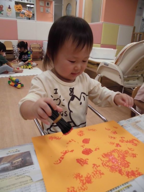 ですが、保育者が「こうやって(綿棒を持って)ポンポン!スタンプだよ〜!」と声をかけるとニヤッと笑い、持ち始め、楽しそうに絵の具を付けていました?画用紙に沢山絵の具をつけると満足したようで「はい、どーじょ?」「でったー!(できたー!)」と絵の具の付いた画用紙を渡してくれました![]()