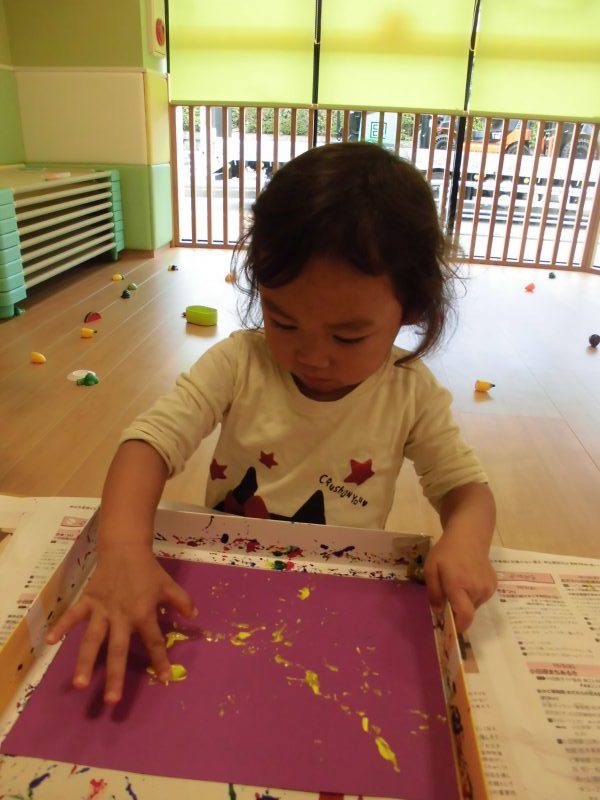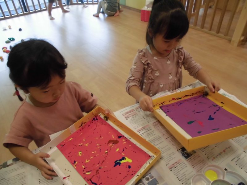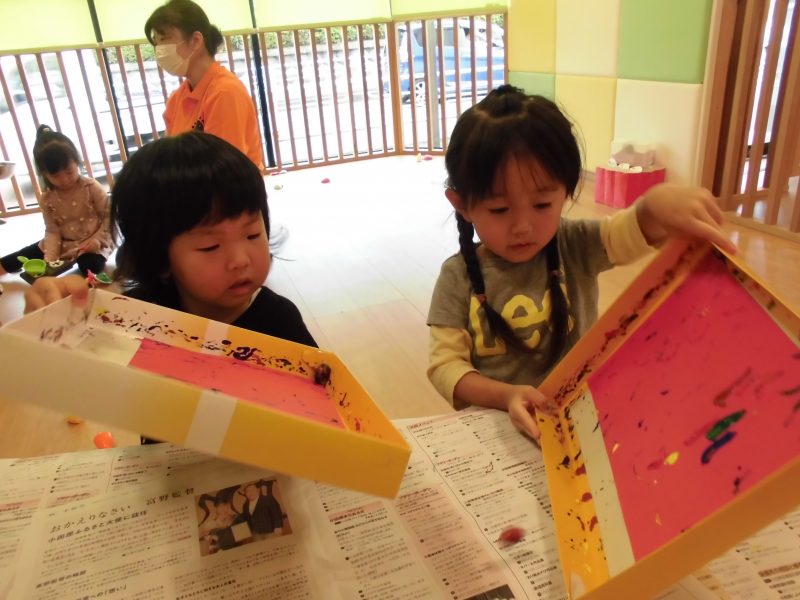 お散歩へ行った時に拾ったどんぐりに絵の具を付けて、箱に入れた画用紙の上でコロコロ遊びをしました!
