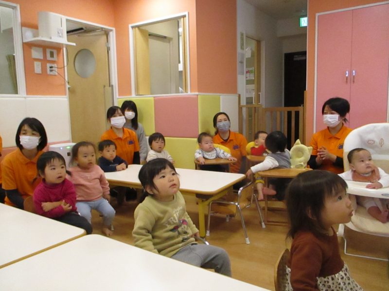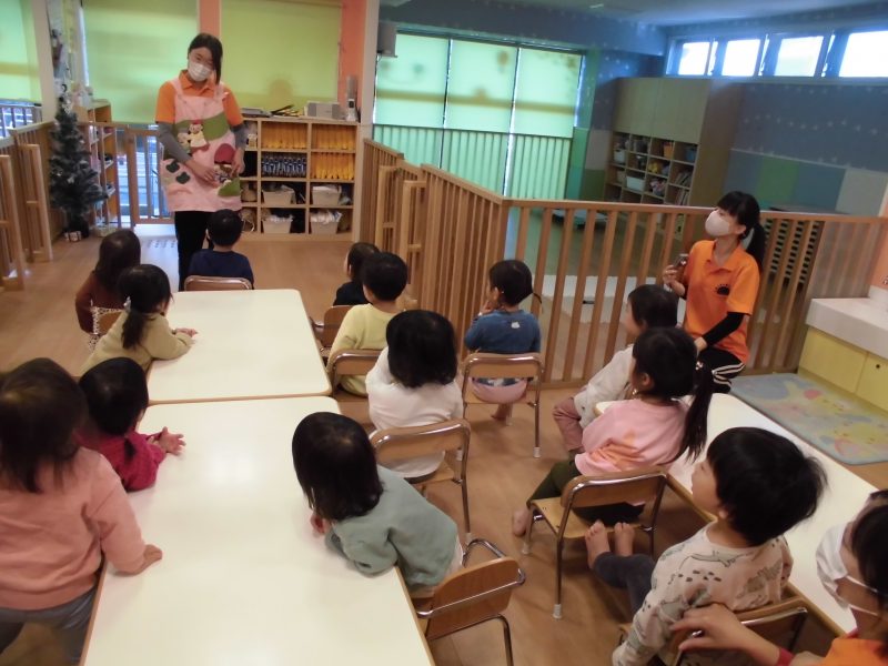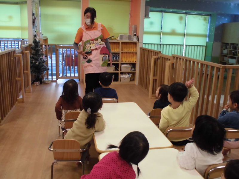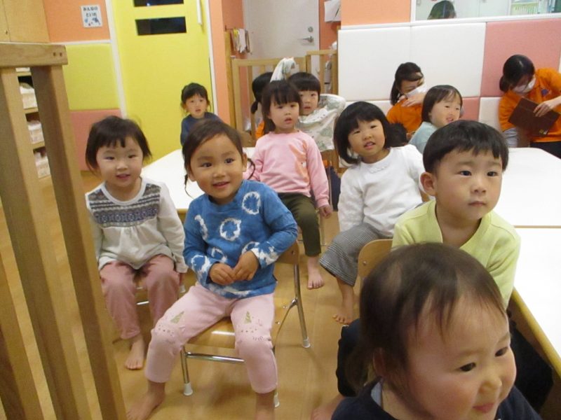 おじいさん?、おばあさん?、娘?、犬?、猫?、ネズミ?が集まって「うんとこしょ、どっこいしょ」とカブを引っ張る場面では、子どもたちも引っ張る真似をして、身体を左右に揺らしていました(●’◡’●)