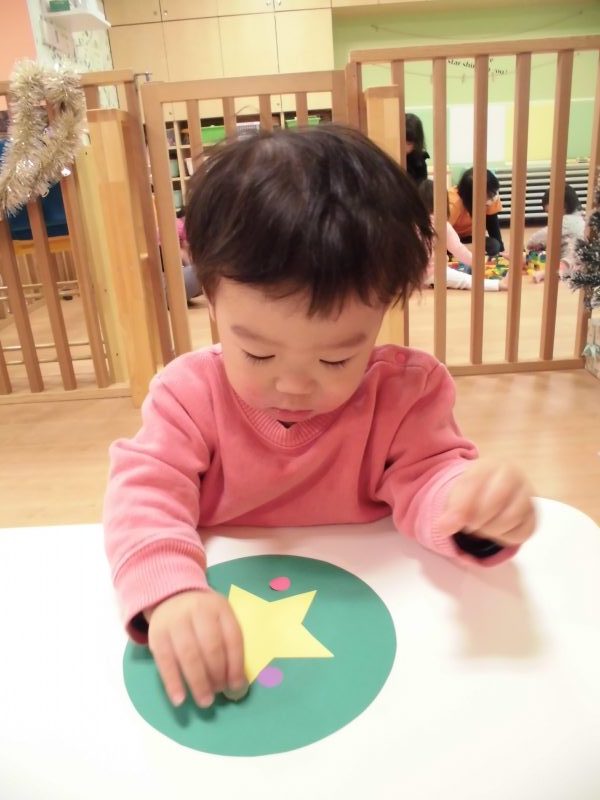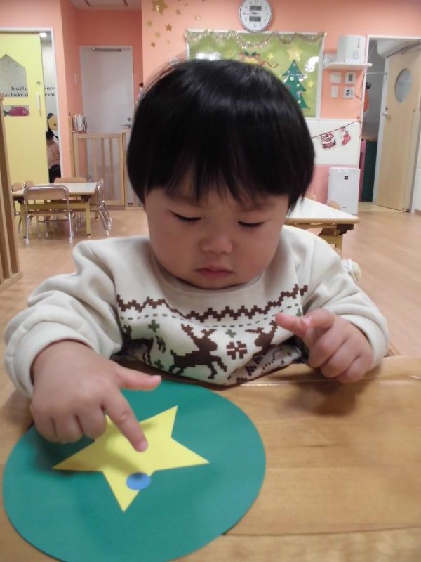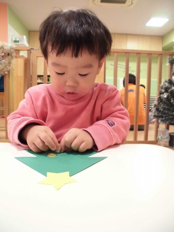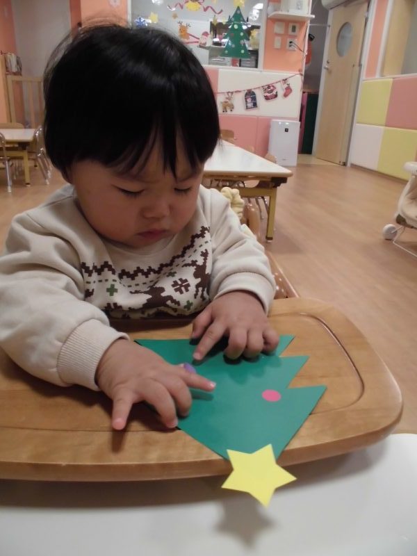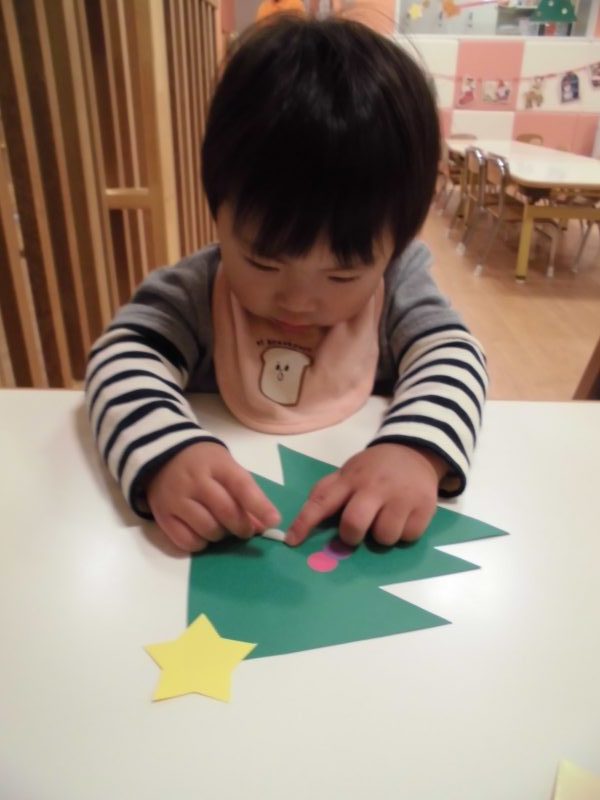 保育者が準備したツリー型の画用紙や丸型の画用紙に丸シールやステッキの形をしたシールをペタペタと貼り飾りつけをしました☆真剣に貼る姿がなんとも可愛らしいもも組さんです