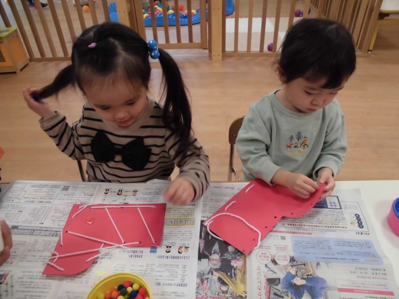 近くの穴に通す子もいれば、遠くの穴に通し始める子もおりましたが、手先が器用な子が多く、ほとんどの子が自分の力だけで完成させていました?