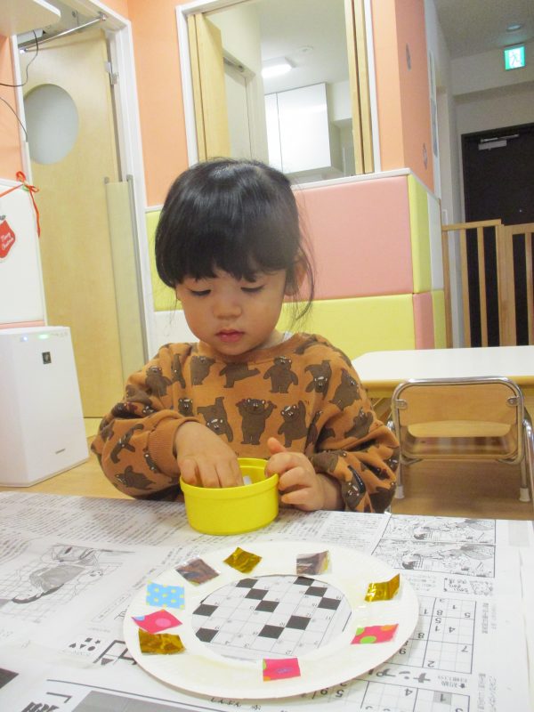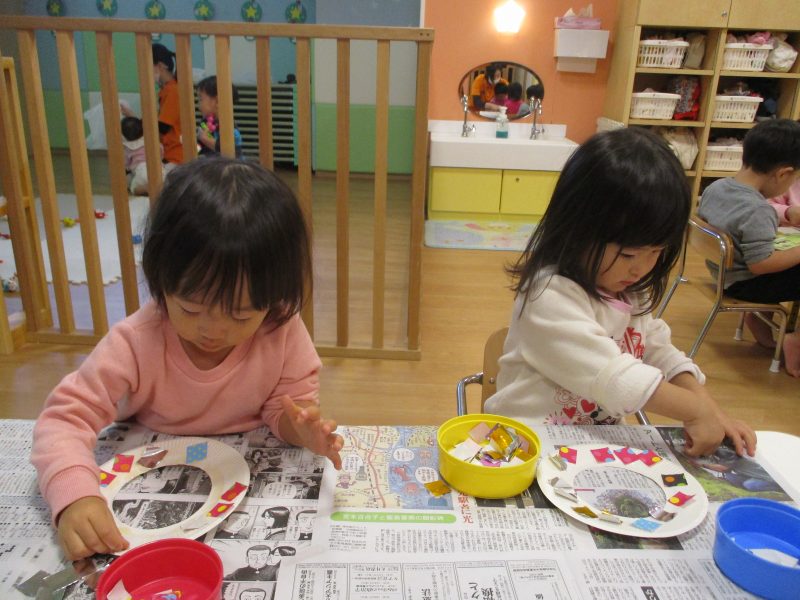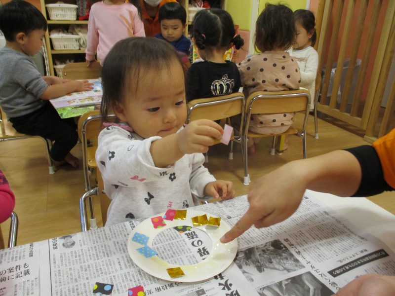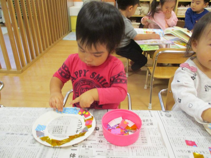 紙皿の中心をくり抜き、ドーナツ状にした型を子どもたちに渡すと、顔ハメパネルのように顔に当て、楽しんでいた子どもたち。糊と折り紙を用意し、「ペタペタ貼っていいですよ(^^)」と声をかけると、好きな柄を選びながら、貼っていきました?