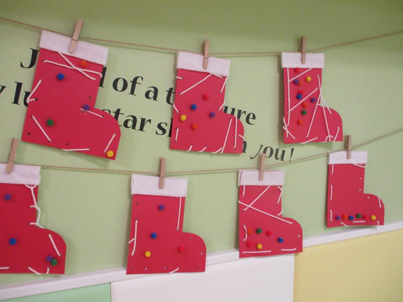 靴下型の穴が開いた画用紙を用意し、子どもたちに紐を通してもらいました!