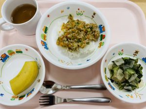※今日は、みんなが大好きなキーマカレー!「良いにおい♪」「早く食べたいよ~♪」と子どもたちの声が聞こえてきて、食に興味があってとても嬉しく思いました。