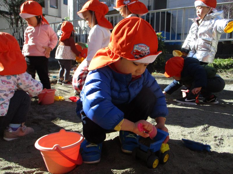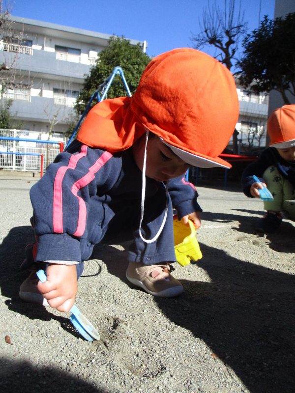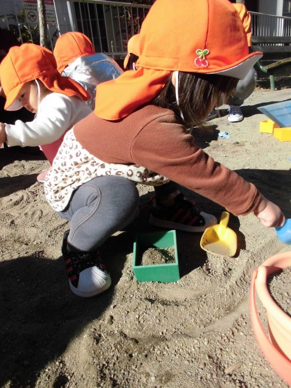カップに砂を入れてカップケーキを作ったり、山を作ったり…砂の感触を楽しみながら様々なものを作って楽しんでいます!