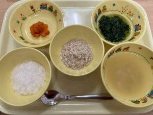 粥 鶏ひき肉のくず煮 ゆでにんじん ほうれん草の煮浸し