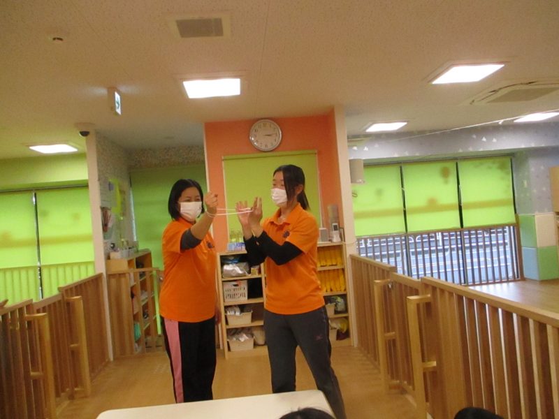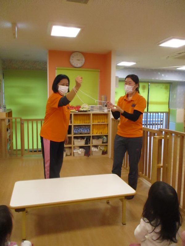 3、2、1の合図で、紐がすり抜ける様子を見せると子どもたちは愕然?「なんで!?」と頭にハテナが浮かんでいたようで食い入るように見つめていました![]()